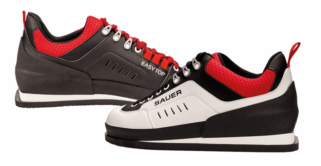 Der Sportschuh EASY TOP von Sauer ist eine Weiterentwicklung des erprobten Vorgängers Easy Style Flex. Abgesehen von der grundlegend neuen Optik, weißt der EASY TOP wesentliche neue Konstruktionsmerkmale auf: Die um vier Einheiten erweiterte Schnürung ermöglicht es, den Fuß noch besser im Schuh zu fixieren und gleichzeitig, einen optimierten Bodenkontakt zu gewährleisten. Eine wichtige Neuerung ist die Fußrücken umschließende, integrierte Zungenlösung. Statt einer separat eingenähten Zunge, wie es üblich ist, wurde die innere Hälfte des Innenschuhs so erweitert, dass sie bis weit unter die äußere Hälfte verläuft und den Fußrücken bis zu den Zehen umschließt. Ihre ausgeprägte Polsterung lässt dabei keine Druckstellen aufkommen. Das verbesserte Fußbett des EASY TOP genügt sport- orthopädischen Ansprüchen. Die Erhöhung im Fersenbereich der Innensohle entlastet den Rücken bei langem Stehen und beugt frühzeitiger Ermüdung vor. Wie sein Vorgängermodell besitzt der EASY TOP eine gegossene, nach innen gewölbte TPU-Sohle die beste Standfestigkeit durch vollflächige Auflage bietet. Auch der umlaufende Gummibesatz als Stabilisator und Schutz gegen Ausweiten wurde beibehalten. Entsprechend den ISSF-Vorschriften wurden die Knöchelpartien freigehalten. Der Bereich unterhalb der Knöchel ist rundum ausgiebig gepolstert.